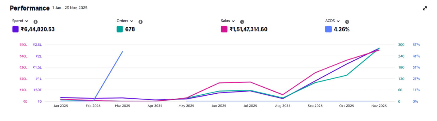 Smart bidding prevented unnecessary spend, keeping early months stable until the category demand started rising.